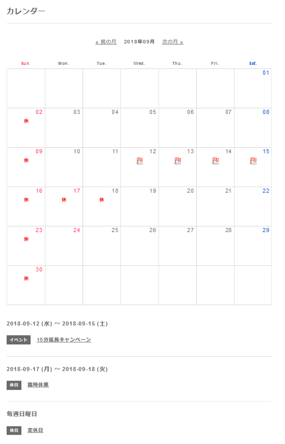 ・定休日の一括設定や夏休み・お盆等の長期休暇も簡単に載せられるカレンダー機能